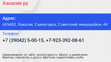 Хакасия.ру по адресу 655602, Хакасия, Саяногорск, Советский микрорайон, 44 в дальнейшем Организация, размещена в следующих категориях: