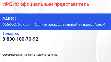 ИРБИС, официальный представитель по адресу 655602, Хакасия, Саяногорск, Заводской микрорайон, 4 в дальнейшем Организация, размещена в следующих категориях: