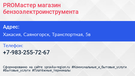 PROМастер, магазин бензоэлектроинструмента по адресу Хакасия, Саяногорск, Транспортная, 5в в дальнейшем Организация, размещена в следующих категориях: