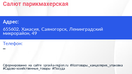 Салют, парикмахерская по адресу 655602, Хакасия, Саяногорск, Ленинградский микрорайон, 49 в дальнейшем Организация, размещена в следующих категориях: