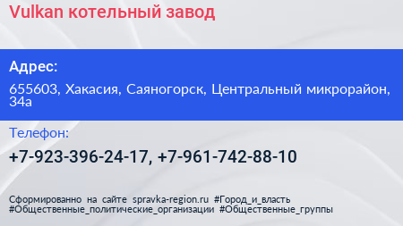 Vulkan, котельный завод по адресу 655603, Хакасия, Саяногорск, Центральный микрорайон, 34а в дальнейшем Организация, размещена в следующих категориях:
