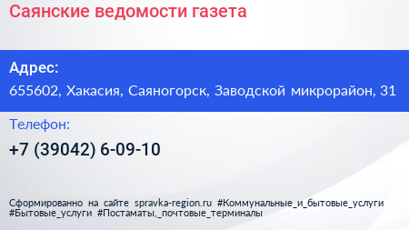 Саянские ведомости, газета по адресу 655602, Хакасия, Саяногорск, Заводской микрорайон, 31 в дальнейшем Организация, размещена в следующих категориях:
