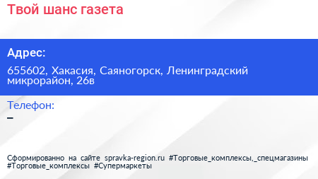 Твой шанс, газета по адресу 655602, Хакасия, Саяногорск, Ленинградский микрорайон, 26в в дальнейшем Организация, размещена в следующих категориях: