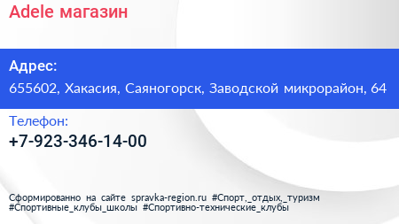 Adele, магазин по адресу 655602, Хакасия, Саяногорск, Заводской микрорайон, 64 в дальнейшем Организация, размещена в следующих категориях: