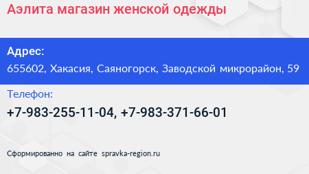 Аэлита, магазин женской одежды по адресу 655602, Хакасия, Саяногорск, Заводской микрорайон, 59 в дальнейшем Организация, размещена в следующих категориях:
