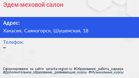 Эдем, меховой салон по адресу Хакасия, Саяногорск, Шушенская, 18 в дальнейшем Организация, размещена в следующих категориях: