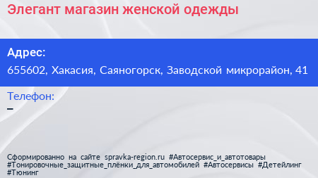 Элегант, магазин женской одежды по адресу 655602, Хакасия, Саяногорск, Заводской микрорайон, 41 в дальнейшем Организация, размещена в следующих категориях: