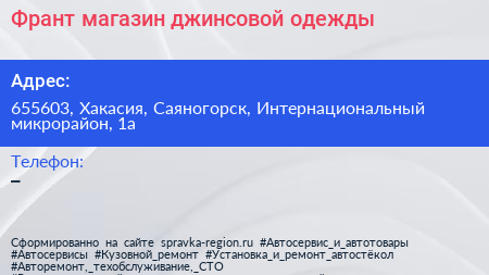 Франт, магазин джинсовой одежды по адресу 655603, Хакасия, Саяногорск, Интернациональный микрорайон, 1а в дальнейшем Организация, размещена в следующих категориях: