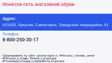 Ионесси, сеть магазинов обуви по адресу 655602, Хакасия, Саяногорск, Заводской микрорайон, 41 в дальнейшем Организация, размещена в следующих категориях:
