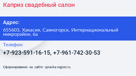 Каприз, свадебный салон по адресу 655603, Хакасия, Саяногорск, Интернациональный микрорайон, 6а в дальнейшем Организация, размещена в следующих категориях: