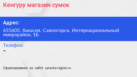 Кенгуру, магазин сумок по адресу 655603, Хакасия, Саяногорск, Интернациональный микрорайон, 1Б в дальнейшем Организация, размещена в следующих категориях: