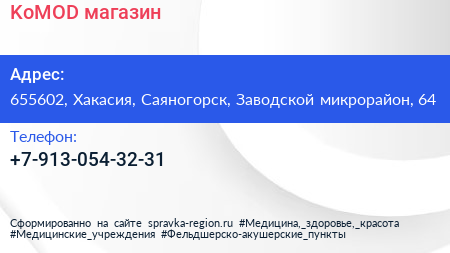 KoMOD, магазин по адресу 655602, Хакасия, Саяногорск, Заводской микрорайон, 64 в дальнейшем Организация, размещена в следующих категориях: