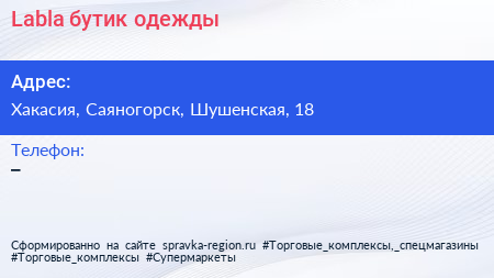 Labla, бутик одежды по адресу Хакасия, Саяногорск, Шушенская, 18 в дальнейшем Организация, размещена в следующих категориях: