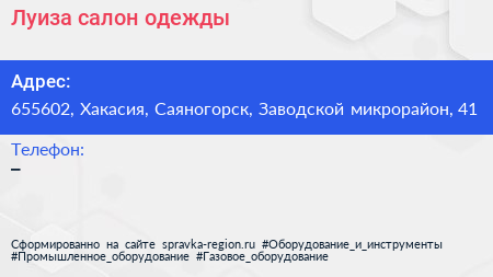 Луиза, салон одежды по адресу 655602, Хакасия, Саяногорск, Заводской микрорайон, 41 в дальнейшем Организация, размещена в следующих категориях: