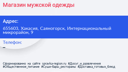 Магазин мужской одежды по адресу 655603, Хакасия, Саяногорск, Интернациональный микрорайон, 9 в дальнейшем Организация, размещена в следующих категориях:
