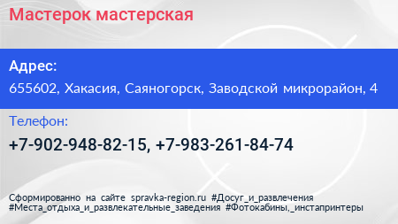 Мастерок, мастерская по адресу 655602, Хакасия, Саяногорск, Заводской микрорайон, 4 в дальнейшем Организация, размещена в следующих категориях: