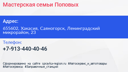Мастерская семьи Поповых по адресу 655602, Хакасия, Саяногорск, Ленинградский микрорайон, 23 в дальнейшем Организация, размещена в следующих категориях: