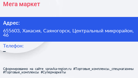 Мега-маркет по адресу 655603, Хакасия, Саяногорск, Центральный микрорайон, 46 в дальнейшем Организация, размещена в следующих категориях: