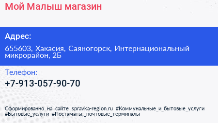 Мой Малыш, магазин по адресу 655603, Хакасия, Саяногорск, Интернациональный микрорайон, 2Б в дальнейшем Организация, размещена в следующих категориях:
