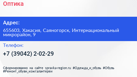 Оптика по адресу 655603, Хакасия, Саяногорск, Интернациональный микрорайон, 9 в дальнейшем Организация, размещена в следующих категориях: