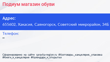 Подиум, магазин обуви по адресу 655602, Хакасия, Саяногорск, Советский микрорайон, 34Б в дальнейшем Организация, размещена в следующих категориях: