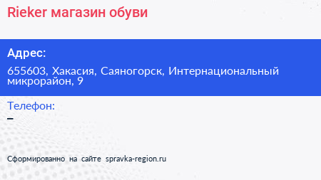 Rieker, магазин обуви по адресу 655603, Хакасия, Саяногорск, Интернациональный микрорайон, 9 в дальнейшем Организация, размещена в следующих категориях: