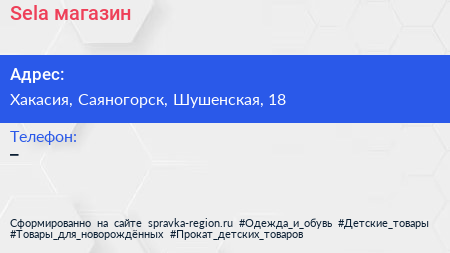 Sela, магазин по адресу Хакасия, Саяногорск, Шушенская, 18 в дальнейшем Организация, размещена в следующих категориях: