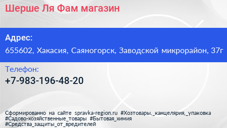 Шерше Ля Фам, магазин по адресу 655602, Хакасия, Саяногорск, Заводской микрорайон, 37г в дальнейшем Организация, размещена в следующих категориях: