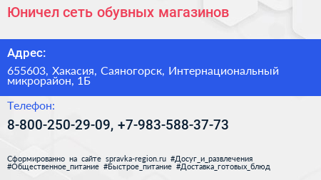 Юничел, сеть обувных магазинов по адресу 655603, Хакасия, Саяногорск, Интернациональный микрорайон, 1Б в дальнейшем Организация, размещена в следующих категориях: