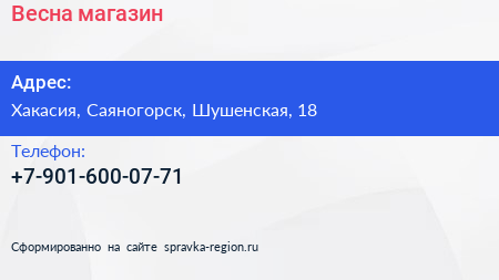 Весна, магазин по адресу Хакасия, Саяногорск, Шушенская, 18 в дальнейшем Организация, размещена в следующих категориях: