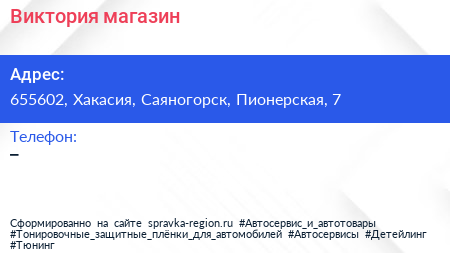 Виктория, магазин по адресу 655602, Хакасия, Саяногорск, Пионерская, 7 в дальнейшем Организация, размещена в следующих категориях: