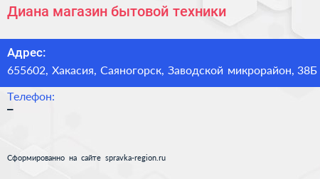 Диана, магазин бытовой техники по адресу 655602, Хакасия, Саяногорск, Заводской микрорайон, 38Б в дальнейшем Организация, размещена в следующих категориях: