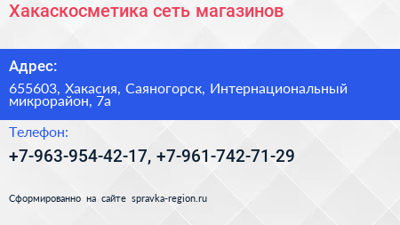 Хакаскосметика, сеть магазинов по адресу 655603, Хакасия, Саяногорск, Интернациональный микрорайон, 7а в дальнейшем Организация, размещена в следующих категориях: