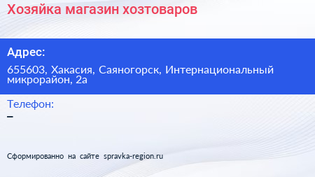 Хозяйка, магазин хозтоваров по адресу 655603, Хакасия, Саяногорск, Интернациональный микрорайон, 2а в дальнейшем Организация, размещена в следующих категориях: