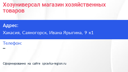 Хозуниверсал, магазин хозяйственных товаров по адресу Хакасия, Саяногорск, Ивана Ярыгина, 9 к1 в дальнейшем Организация, размещена в следующих категориях: