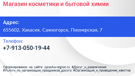 Магазин косметики и бытовой химии по адресу 655602, Хакасия, Саяногорск, Пионерская, 7 в дальнейшем Организация, размещена в следующих категориях: