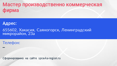 Мастер, производственно-коммерческая фирма по адресу 655602, Хакасия, Саяногорск, Ленинградский микрорайон, 23а в дальнейшем Организация, размещена в следующих категориях: