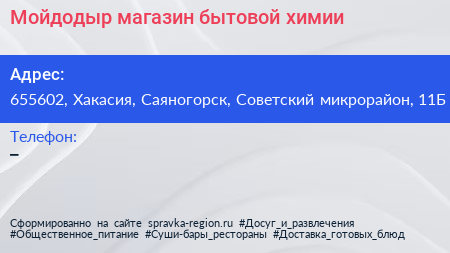 Мойдодыр, магазин бытовой химии по адресу 655602, Хакасия, Саяногорск, Советский микрорайон, 11Б в дальнейшем Организация, размещена в следующих категориях: