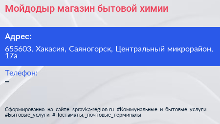 Мойдодыр, магазин бытовой химии по адресу 655603, Хакасия, Саяногорск, Центральный микрорайон, 17а в дальнейшем Организация, размещена в следующих категориях: