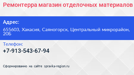 Ремонтерра, магазин отделочных материалов по адресу 655603, Хакасия, Саяногорск, Центральный микрорайон, 20Б в дальнейшем Организация, размещена в следующих категориях: