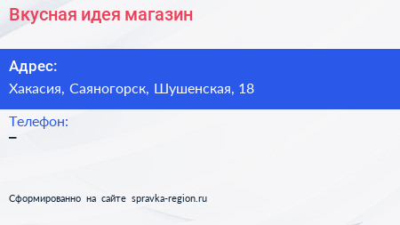 Вкусная идея, магазин по адресу Хакасия, Саяногорск, Шушенская, 18 в дальнейшем Организация, размещена в следующих категориях: