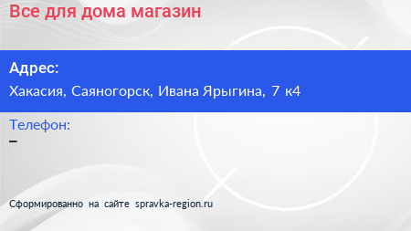 Все для дома, магазин по адресу Хакасия, Саяногорск, Ивана Ярыгина, 7 к4 в дальнейшем Организация, размещена в следующих категориях: