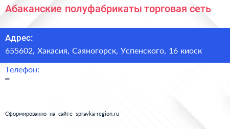 Абаканские полуфабрикаты, торговая сеть по адресу 655602, Хакасия, Саяногорск, Успенского, 16 киоск в дальнейшем Организация, размещена в следующих категориях:
