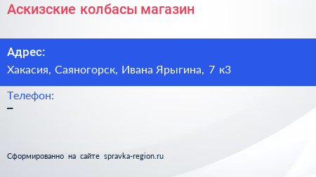 Аскизские колбасы, магазин по адресу Хакасия, Саяногорск, Ивана Ярыгина, 7 к3 в дальнейшем Организация, размещена в следующих категориях: