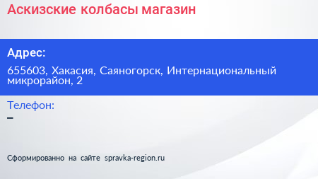 Аскизские колбасы, магазин по адресу 655603, Хакасия, Саяногорск, Интернациональный микрорайон, 2 в дальнейшем Организация, размещена в следующих категориях: