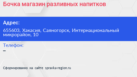 Бочка, магазин разливных напитков по адресу 655603, Хакасия, Саяногорск, Интернациональный микрорайон, 10 в дальнейшем Организация, размещена в следующих категориях: