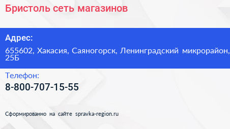 Бристоль, сеть магазинов по адресу 655602, Хакасия, Саяногорск, Ленинградский микрорайон, 25Б в дальнейшем Организация, размещена в следующих категориях: