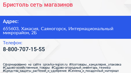 Бристоль, сеть магазинов по адресу 655603, Хакасия, Саяногорск, Интернациональный микрорайон, 2Б в дальнейшем Организация, размещена в следующих категориях: