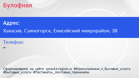 Булофная по адресу Хакасия, Саяногорск, Енисейский микрорайон, 38 в дальнейшем Организация, размещена в следующих категориях:
