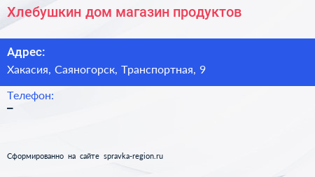 Хлебушкин дом, магазин продуктов по адресу Хакасия, Саяногорск, Транспортная, 9 в дальнейшем Организация, размещена в следующих категориях: